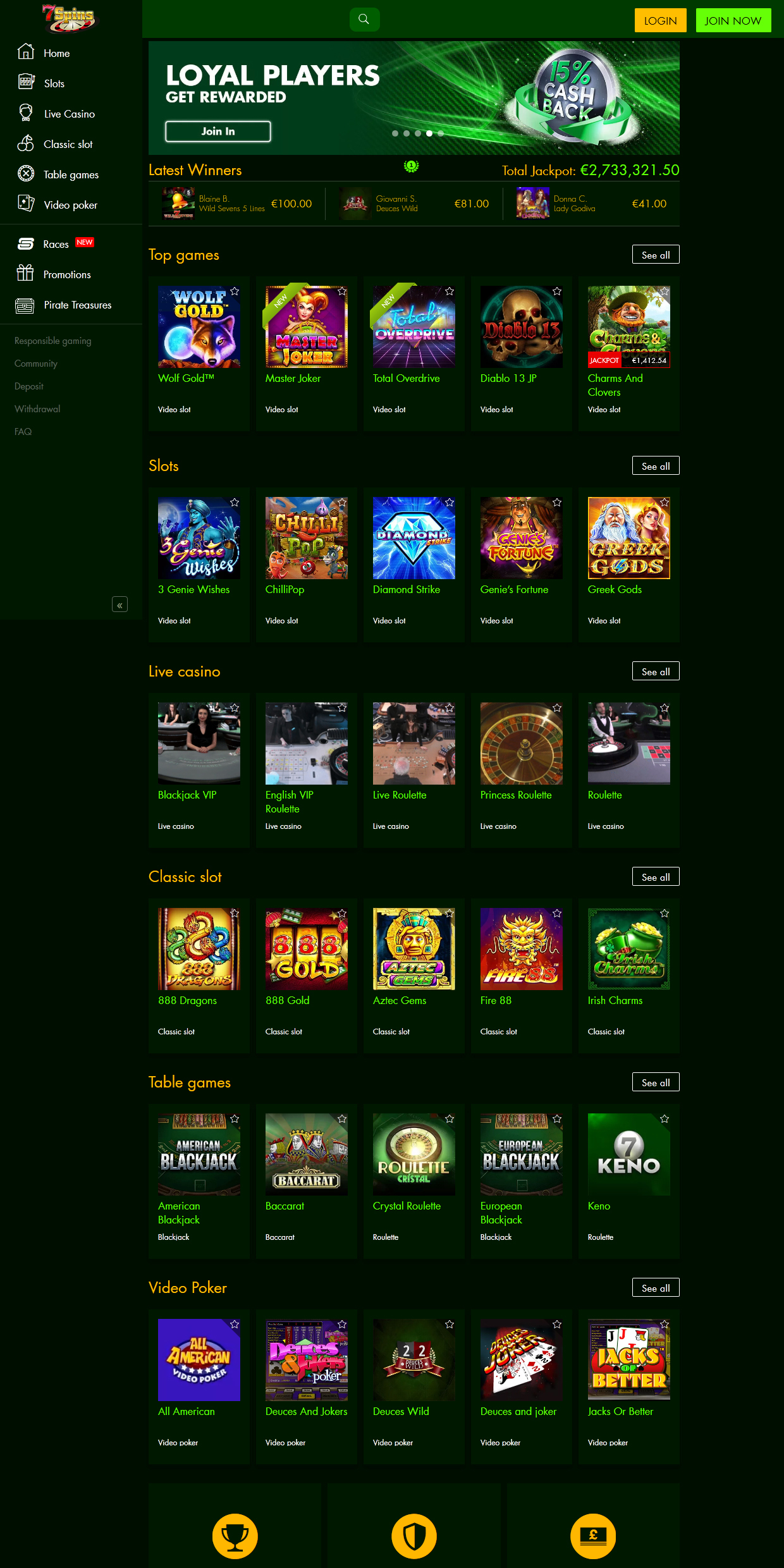 O design visual do site do cassino é simplificado e sem brilho. Contra o sólido fundo escuro, a página principal apresenta cerca de 20 miniaturas de tamanho médio divididas por categorias, como jogos de topo, Pokies e Live Casino. Cada categoria tem o botão Veja todos os usuários, permitindo que os usuários procurem todo o conteúdo da categoria selecionada. No topo da página principal, há o último bloco de vencedores que mostra uma lista alternada dos vencedores mais recentes, os jogos em que venceram e o valor vencido. Além disso, um campo de jackpot total dinâmico mostra o valor total de todos os jackpots disponíveis no cassino online revisado. Isso pode atuar como um forte incentivo para os jogadores tentarem um ou outro jogo por dinheiro real.Faça até US € 7500 em bônus de boas -vindas!