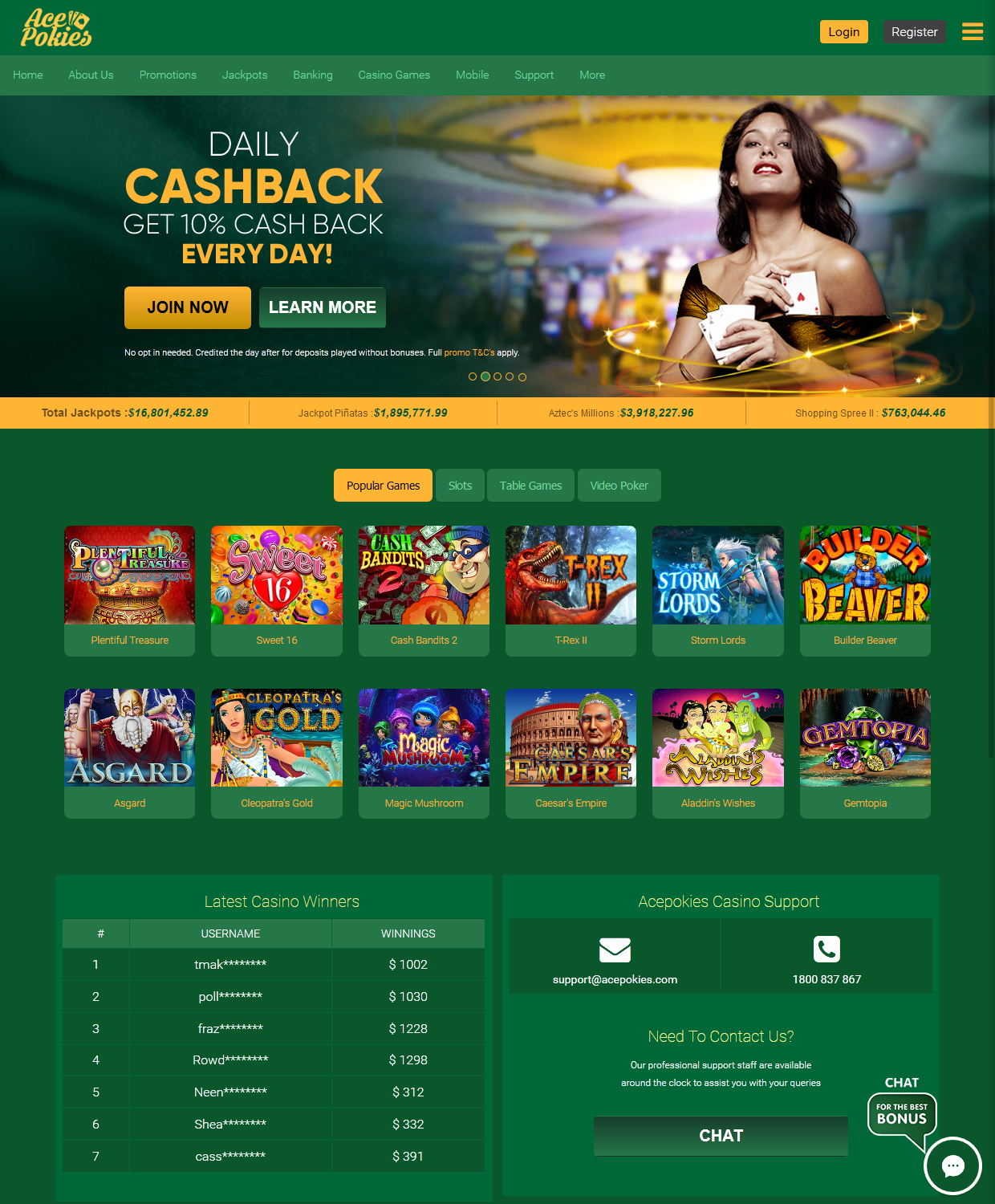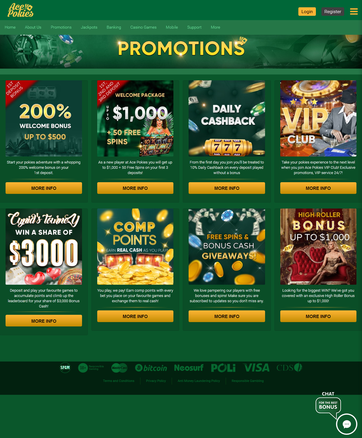 ace Pokies tem uma ampla seleção de mais de 200 jogos alimentados pela rtg. variando de Pokies a blackjack, eles oferecem diversão final, porcentagem de pagamento alto e toneladas de recursos de bônus para jogadores da austrália que teriam concluído o processo de inscrição simples e jogado por dinheiro real. o site tem um design elegante com a paleta de cores verde dominando o esquema visual e uma navegação intuitiva para permitir que todos navegassem pelo site do cassino da maneira mais eficiente e segura. a ace Pokies possui um extenso programa de bônus que atualmente totaliza mais de 10 promoções direcionadas a iniciantes e apostadores leais.