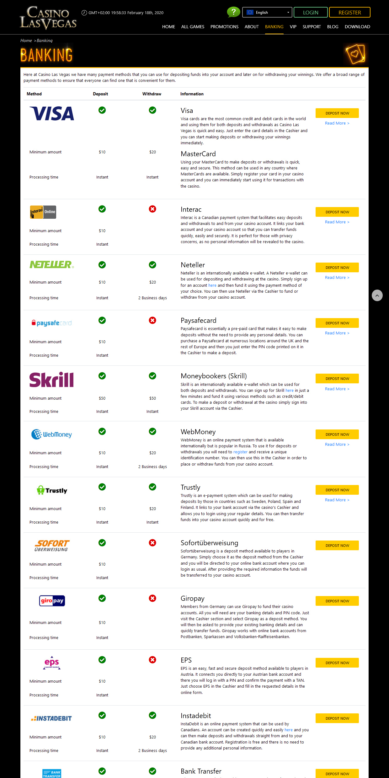 o cassino oferece depósitos seguros por meio dos seguintes métodos: visa, mastercard, neteller, skrill, transferência bancária, ecopayz e idebit. para a maioria dos métodos, o valor mínimo aceitável é de us € 10 e todas as transferências não envolvem taxas associadas pelo cassino (com certeza, terceiros podem impor alguns a seu próprio critério). os limites máximos também são governados pelas políticas de operadores financeiros relacionados, não pelo cassino.