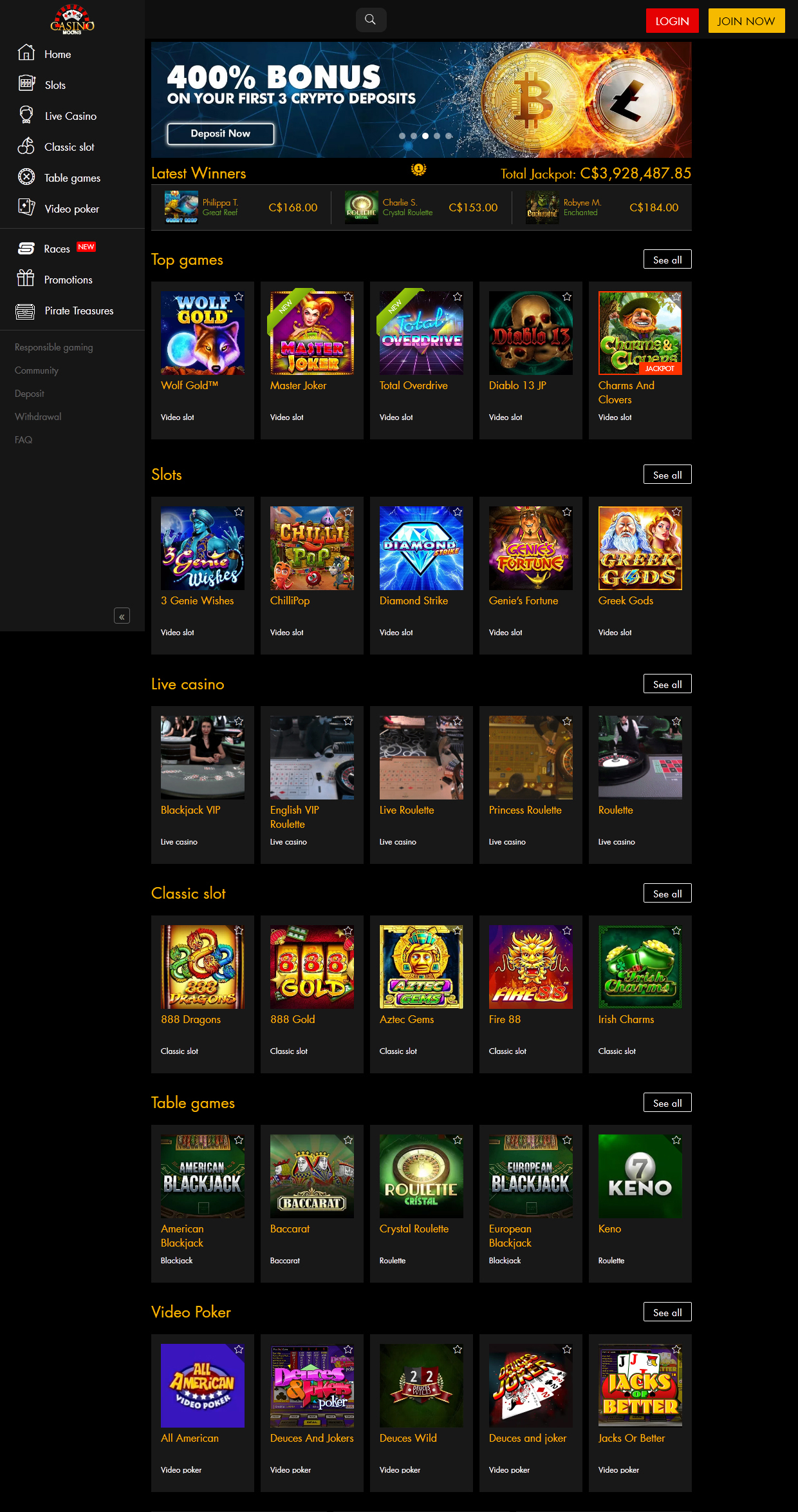 o casino moons é um cassino on -line com mais de 300 pokies de três fornecedores e um cassino ao vivo alimentado por jogos vivo. juntamente com o fiat dinheiros tradicional, o cassino aceita bitcoins, o que é uma grande vantagem para os devotos de criptografia. os jogos não são o único fator que atrai milhares de jogadores da nova zelândia para o cassino online - graças ao seu programa de bônus versátil e abrangente, os jogadores podem obter opções de entretenimento definitivas a qualquer momento. além de recarregar e rodadas gratuitas, os jogadores são convidados a participar de corridas diárias/semanais de pokie e também competem pelo primeiro prêmio de us € 10.000 concedidos ao sortudo vencedor no lindo torneio vip.