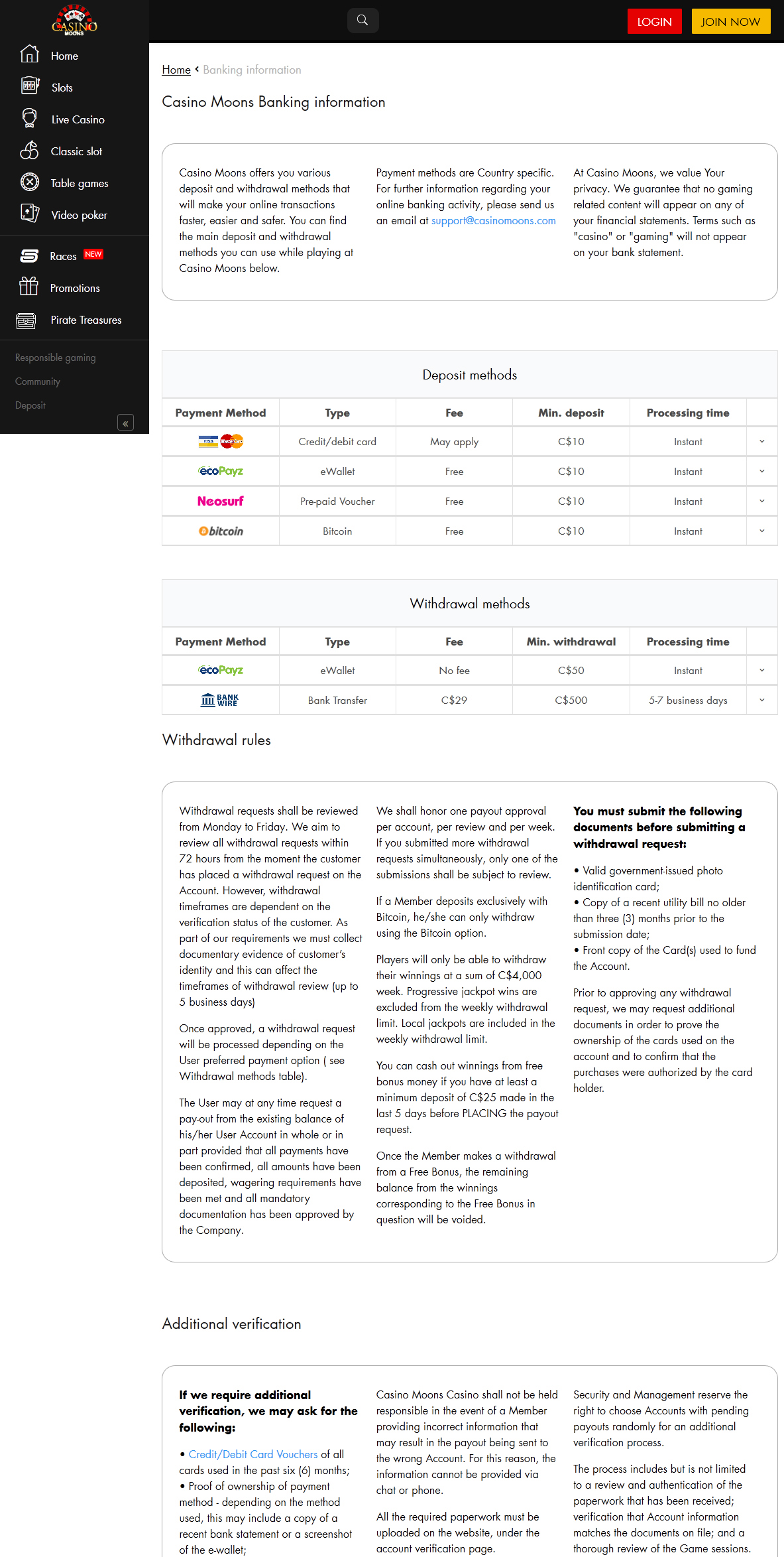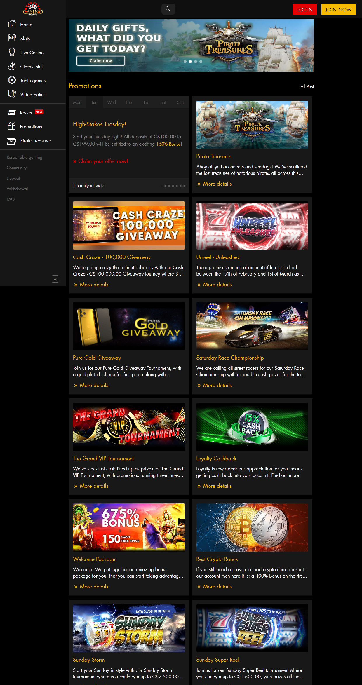 todos os dias, os jogadores podem reivindicar alguns bônus de recarga e giros gratuitos. além disso, há um reembolso de 15% válido às segundas -feiras. como um toque final para o já extenso sistema de bônus, o casino moons realiza torneios em andamento, que são conhecidos como pokie races. seus participantes apenas giram os rolos de seus Pokies favoritos normalmente, ganham pontos e ganham prêmios impressionantes em torneios. para jogadores vip, há freerolls dedicados com enormes prêmios em dinheiro e giros gratuitos.