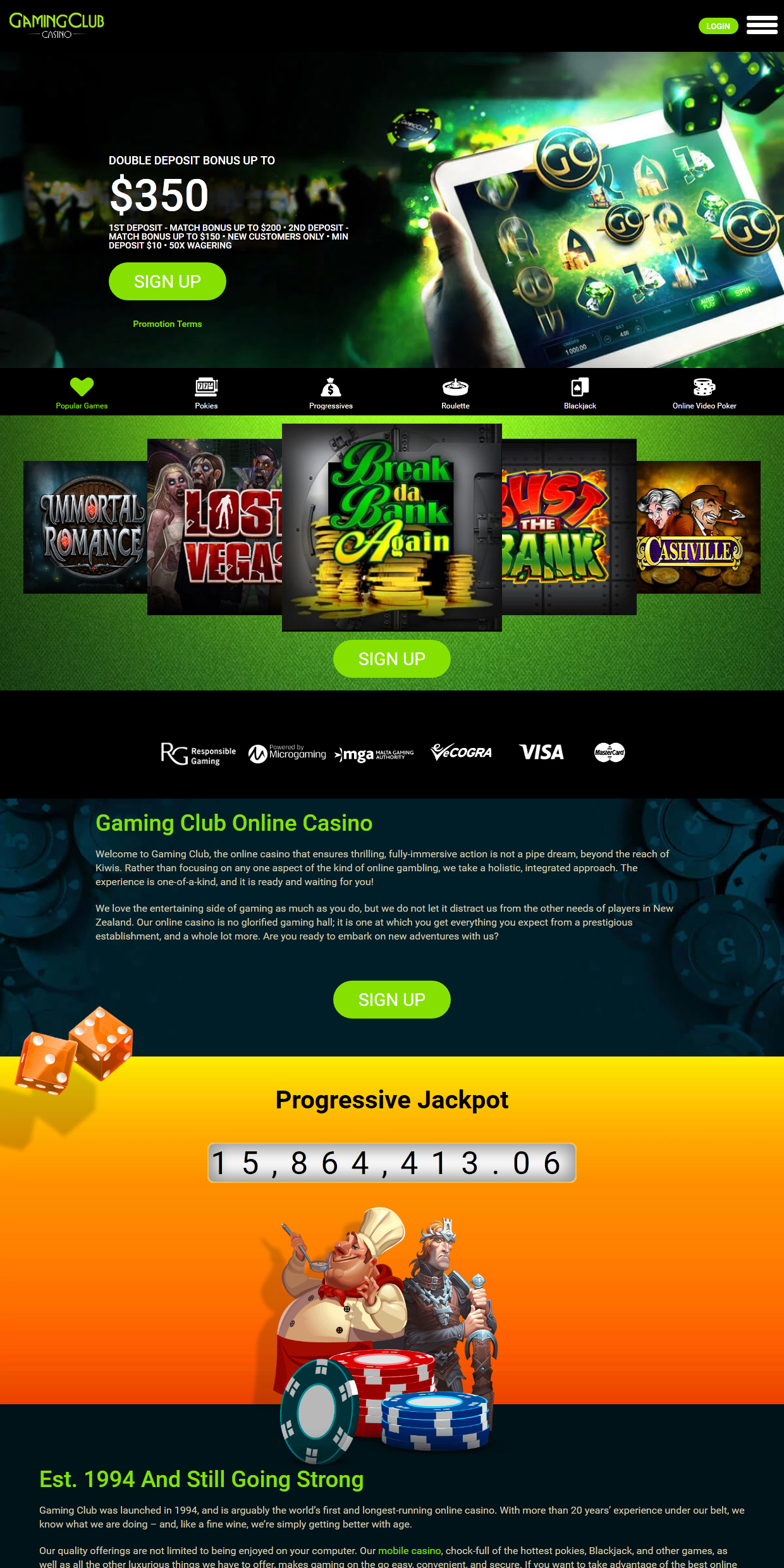 O cassino online revisado foi fundado em 1994 e, portanto, é um dos cassinos mais antigos e estabelecidos há muito tempo do mercado. A reputação impecável e a transparência financeira impecável são o que faz o cassino se destacar em meio à concorrência. Como qualquer site orientado a microgaming por aí, o Gaming Club oferece a aplicação interna da Microgaming que atua como um método alternativo de acesso livre de navegador aos jogos. Além disso, o cassino on-line tem uma justiça de jogos oficialmente certificada avaliada pela ECOGRA, uma empresa de auditoria mais bem classificada. Os jogadores podem clicar no link de porcentagens de pagamento no rodapé do site para visualizar um documento em PDF que lista pagamentos relacionados para todos os jogos oferecidos pelo cassino. O Gaming Club também administra um blog onde publica artigos sobre os Pokies lançados recentemente e outras informações interessantes relevantes para jogos de azar e esportes. O blog é normalmente atualizado a cada semana.Obtenha bônus de US € 350!