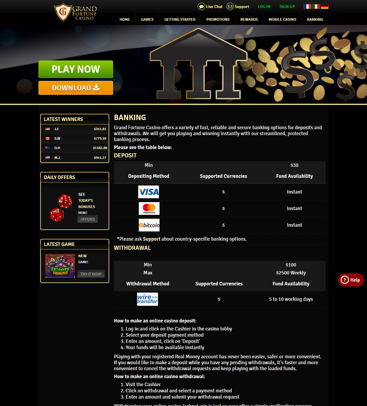 o jackpot fortuito vence, as promoções em abundância e os agentes de suporte amigáveis são apenas algumas coisas que um usuário da nova zelândia enfrentará no grand fortune, um cassino on -line legal dirigido pelo software rtg. antes de prosseguir com um extenso conjunto de Pokies, um novo usuário é convidado a reivindicar um bônus de boas -vindas de 200% com uma condição de apostas fenomenalmente baixa do x5. mas este não é o fim do programa de bônus - ofertas diárias, generosos giros gratuitos com baixa wr e outros bônus emocionantes acompanharão um jogador da austrália o tempo todo. não há problemas com os pagamentos, pois todas as solicitações são processadas de maneira rápida e profissionalmente. a grand fortune está disponível em dois formatos: como um aplicativo rtg de marca que deve ser instalado em um computador e; como um navegador normal, jogue o cassino com acesso direto a todo o conteúdo de jogos. nenhuma qualidade está comprometida no modo de jogo.