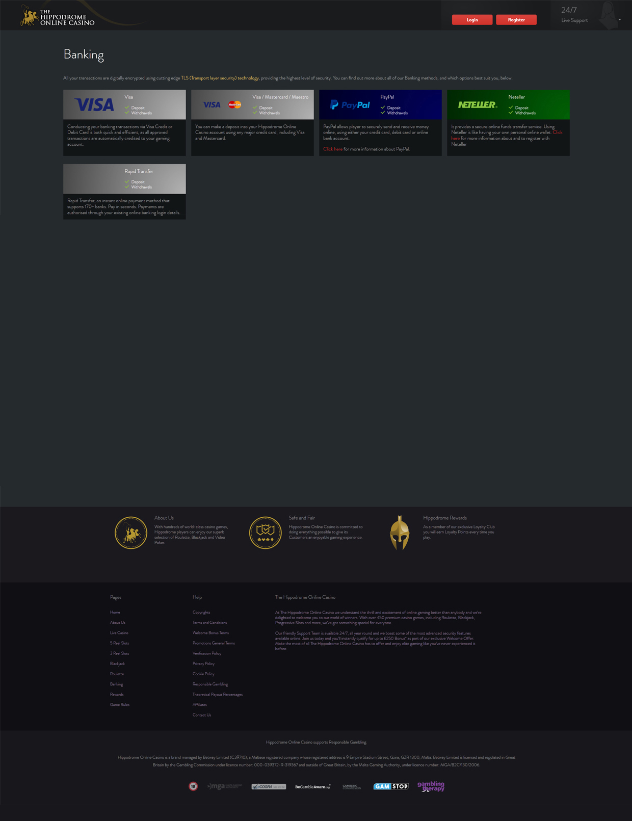 os jogadores podem realizar suas transações de depósito por meio de cinco métodos: visa, mastercard, paypal, neteller e rapid transfer. tudo isso permite pagamentos rápidos e seguros que são creditados automaticamente na conta do cassino dentro de alguns segundos. as transações min/max dependem apenas do método selecionado. normalmente, eles são iguais a us € 10 (min) e us € 5000 (máximo) com algumas exceções.