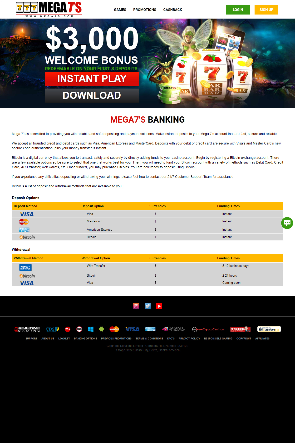 usd é a única moeda no mega 7s. sempre que um usuário da nova zelândia tentar transferir o nzd para a conta, a transação será bem -sucedida, mas os dólares da austrália (e outras moedas) serão convertidos em usd automaticamente. o mesmo se refere a Bitcoins - eles são aceitos aqui, mas uma quantia final visível na conta do cassino será exibida em usd, não importa o quê. os métodos de depósitos são visa, mastercard e Bitcoin, todos com horários de financiamento instantâneos.