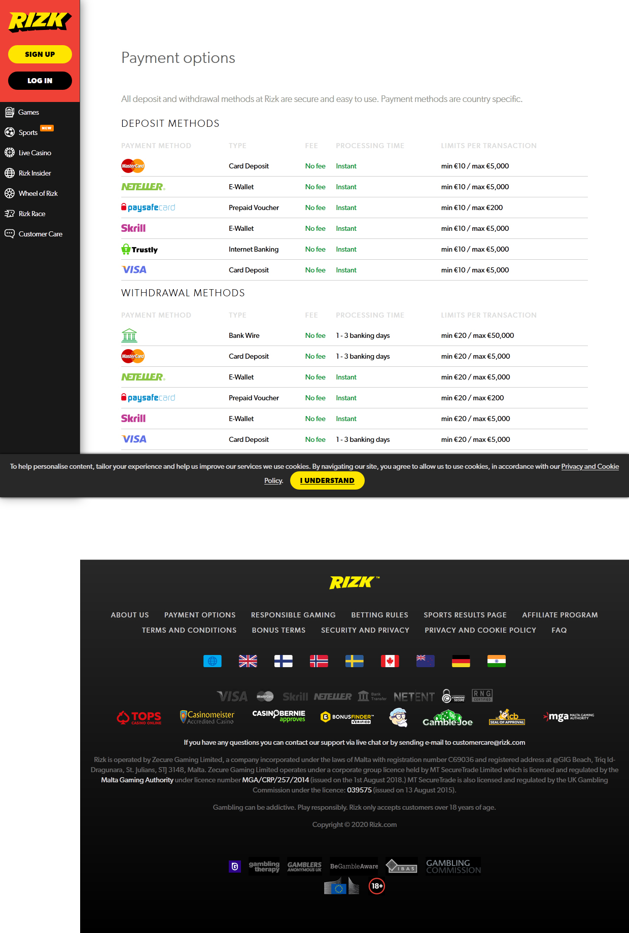 os saques de Rizk são tão amigáveis quanto possível. o limite mínimo é de us € 10 (ou equivalente em moeda), o que é uma boa notícia para rolos baixos e apostadores casuais com pequenos orçamentos. os métodos são realmente os mesmos que acima, exceto o mastercard, que não podem ser usados para retirar dinheiro. além disso, um jogador também pode recuperar o dinheiro do cassino por transferência bancária. o valor mínimo de caixa é de us € 20 ou não menor que o depósito inicial. o limite máximo é de us € 5000 para todos os métodos, exceto para transferência bancária, que é de us € 50.000 por transação.