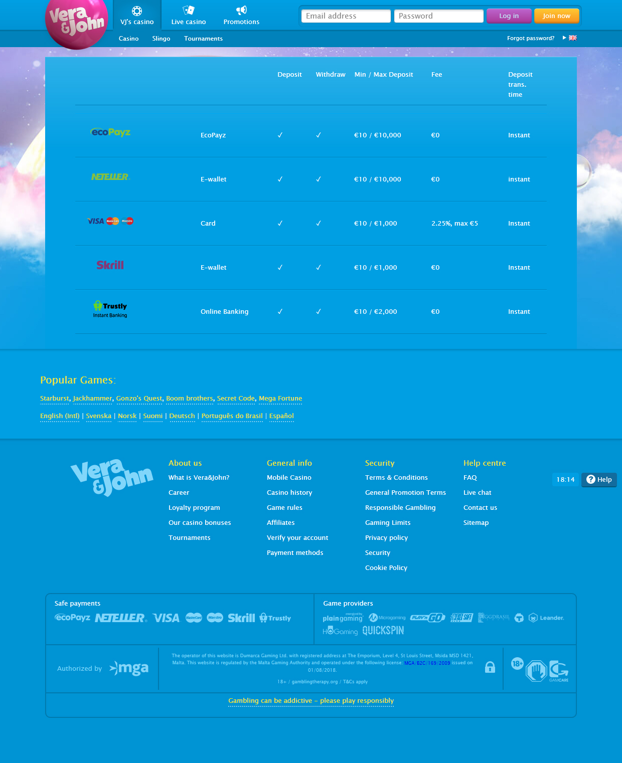 vera e john tenta tornar os pagamentos o mais confortável possível. com isso em vista, ele oferece um conjunto de métodos convenientes, como visa, mastercard, ecopayz, skrill, neteller e paysafecard. os Bitcoins não são aceitos (na seção de perguntas frequentes, eles claramente afirmam que "não" aceitam Bitcoins). de qualquer forma, o valor mínimo do depósito é de us € 10. os jogadores que têm problemas de jogo são bem -vindos para estabelecer limites de depósito e também alterá -los a qualquer momento.