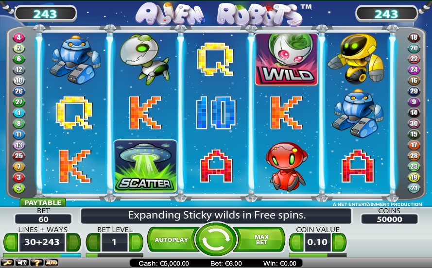 Mesmo pelos padrões de hoje, os robôs alienígenas são um Pokie "medíocre", com um pequeno número de recursos, incluindo um selvagem, um selvagem e rotações selvagens e grátis. No entanto, uma fusão surpreendentemente bem-sucedida dos quadros de jogos da linha de pagamento e da linha não paga faz do Pokie um jogo único e exclusivo que você deve tentar.