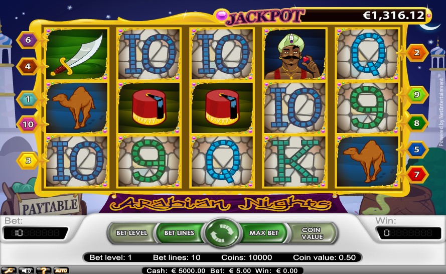 Se esta é a primeira vez que você joga noites árabes, você pode pensar nisso como um jogo comum. Realmente tem gráficos simples e simples e falha em causar muita impressão, não se fosse por um grande jackpot progressivo. Vamos começar com o tema Pokie. O Pokie está associado a contos e histórias folclóricos orientais compilados em Mil e uma noites. atrás dos rolos, você verá minaretes no estilo de desenhos animados, uma cesta com uma cobra dentro, paredes da cidade e um céu noturno. os símbolos do pokie são do tipo oriental e incluem um camelo, uma fez vermelha, uma barraca, sapatos verdes com dedos pontiagudos e um sabre. também existem valores de cartas de jogo 9, 10, j, q e k. eles são feitos na forma de azulejos de mosaico e se encaixam organicamente no tema.