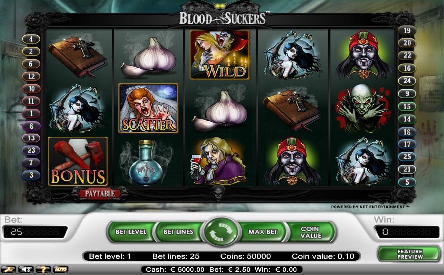um vampiro selvagem, mordendo uma mulher bonita e deixando duas manchas sangrentas no pescoço, é um símbolo selvagem. é o vampiro mais bem remunerado que creditará x5 a x7500 por 2-5 deles desembarcou em uma linha de pagamento. o equivalente em dinheiro máximo para atingir cinco wilds é um surpreendente us € 15.000. bem, o valor não é tão grande em comparação com alguns Pokies progressivos, mas, dada a aposta máxima de us € 50 neste pokie, o referido prêmio é muito bom.