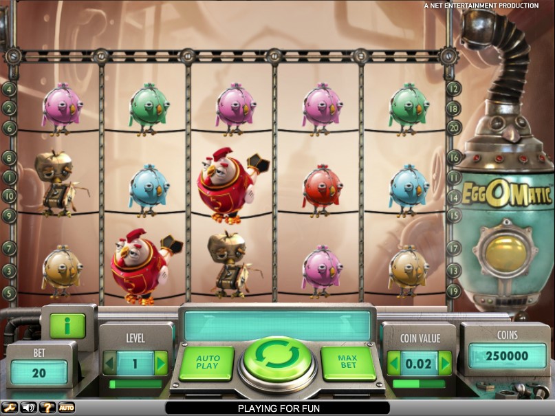 os símbolos de baixa classificação são galinhas laranja, azul, verde, rosa e vermelho, concedendo x5 a x75. os símbolos de alto escalão são retratados por diferentes galinhas que pagam x10 a x1000. dito isto, os três principais prêmios do Eggomatic são us € 10.000 (cinco galinhas vermelhas), us € 7000 (cinco galinhas com corações azuis) e us € 5000 (green robot glet). o pokie é um jogo bastante volátil com ganhos de baixo e tamanho médio.